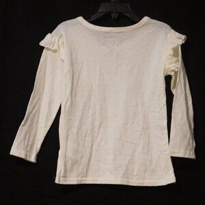 Disney Tee. Crème. Long Sleeve. Front Graphic Minnie Moused Dressed as a Witch with a Silver Sequin Cape. Ruffles on Shoulders. Cotton Blend. Girl’s Size 3T. Great Used Condition.