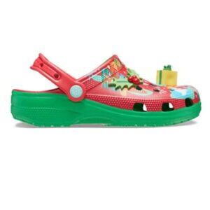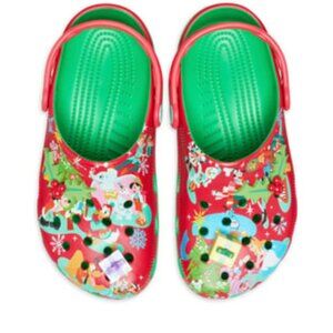 It's a nonstop celebration with your very best pals when you slip on these Mickey Mouse and Friends holiday Crocs. The festive print features Mickey, Minnie, Pluto, Simba, Tinker Bell and others exchanging gifts by the tree. Featuring iconic Crocs comfort and style, they come with four jolly Jibbitz to make your season merry and bright and so very comfy.