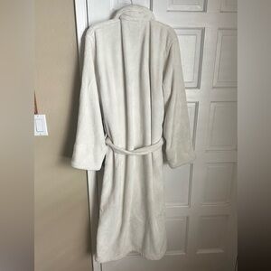 One size fits most. Good condition!! Super soft and cozy!! Nothing wrong with it!! Off white robe