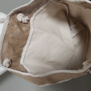 The tan and cream bag is spacious and perfect for a day on the island. Blue embroidery stands out.