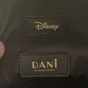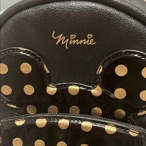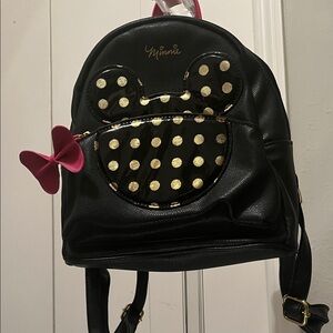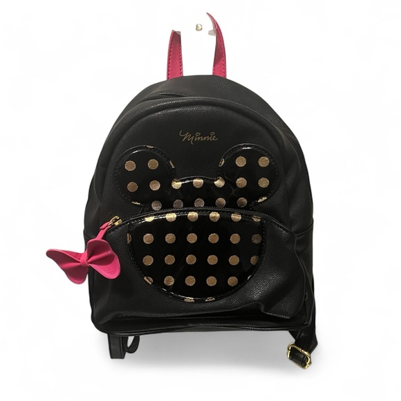 Disney Dani by Danielle Nicole - Charming black mini backpack with Minnie Mouse design. Features pink bow and gold polka dots. Perfect for Disney fans. Great gently used condition. No signs of rips, tears, fraying. Outside zipped pocket in front. (No interior pockets).
