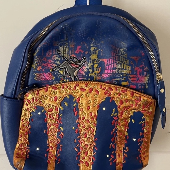 The mini backpack “Lights Under the Marigold Bridge” was designed by Danielle Nicole for Disney’s “Coco.” It includes elaborate embellishment and a light-up feature bringing twinkling lights to the reflective water. This is functioning and is controlled by a switch in the front zip pocket. The bag also has a main zipper pocket and adjustable shoulder straps. In like new condition.