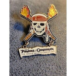 Disney Pirates of the Caribbean Dead Man's Chest Skull Logo 2006 Pin. This is a dangle pin featuring glitter torches. It is in excellent condition.