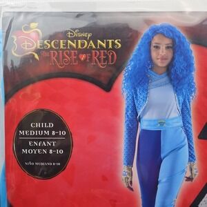 The Disney Descendants 4 The Rise Of Red Chloe Halloween Costume is a child medium size outfit featuring the character Red Chloe from the popular Disney series. The costume includes a complete outfit in a blue color with elastic and stretch features, making it comfortable for young girls to wear during Halloween or themed events. With the official Disney branding, this costume is sure to be a hit among fans of the Descendants series looking to dress up in style.