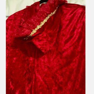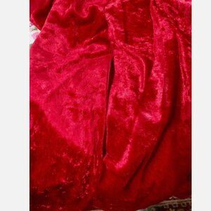 Color/Material: red velvet, organza ruffle, gold braid trim