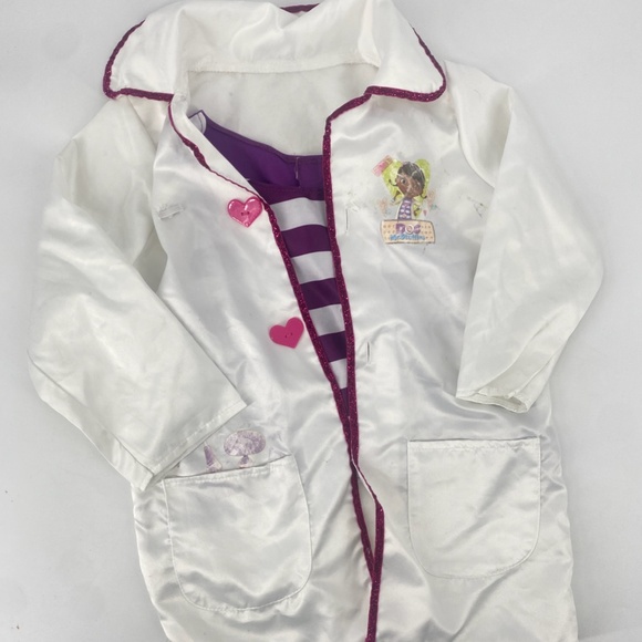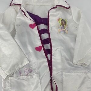 Pre-owned Disney Doc McStuffins doctor’s dress-up lab coat in size 4-6X. This fun set includes a white lab coat paired with a purple and white striped shirt. Ideal for dress-up play, it’s made from 100% polyester. Please note that after washing, the print has faded (see photo for details).