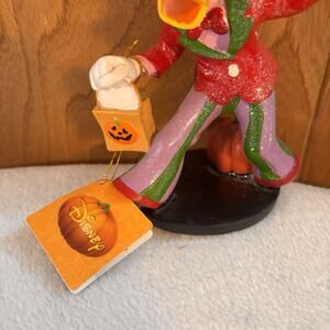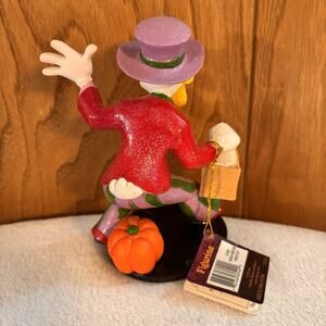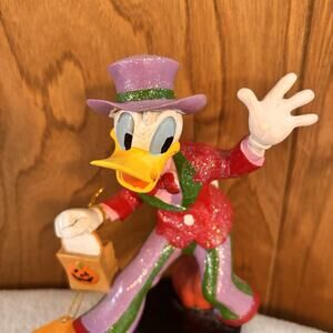 Add some Disney magic to your Halloween decor with this Donald Duck figurine! Dressed in a glittery red and purple suit with a pumpkin treat bag in hand, this collectible piece brings festive fun to any display.