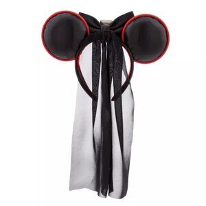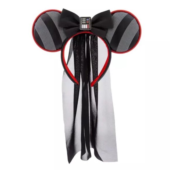 Let the power go to your head with this Darth Vader ear headband. Fashioned in black and gray stripes with red trim and interior, it has a black veil down the back that calls to mind his signature cape. Topping it off is a black bow accented with a charm depicting the Lord Vader's chest plate.