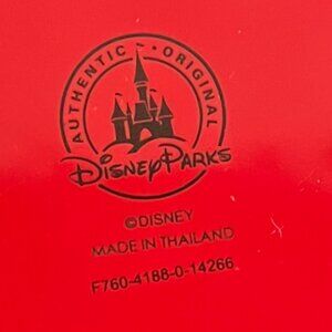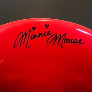 Disney Parks super cute ceramic mug with an embossed image of Minnie Mouse’s signature red with white dotted hair bow against a wraparound black background with large white polka dots. Bright red interior features black cursive text below the rim that reads, Minnie Mouse. Cute black hearts dot the letter i in Minnie. Large and comfortable easy-to-grip red handle. Measures 4.tall with a 3.5” diameter; 5” across including handle. Holds 16 fluid oz. The red underside features the Disney castle logo and text that reads, From Authentic Original Disney Parks. © DISNEY. Made in Thailand. F760-4188-0-14266