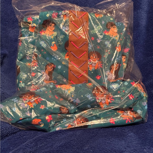 Vibrant backpack with character print. Features a mix of teal, pink, and brown colors.