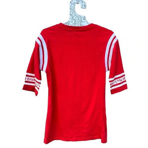 Disney Epcot Mickey Mouse short sleeve shirt. Baseball style with white stripes on each arm. Multi-face design with outlined and flag faces. Size L