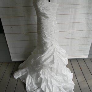Disney Fairytale Weddings Dress ALFRED ANGELO 214C RAPUNZEL WHITE FIT FLARE 10. GORGEOUS RUCHING ON TOP AND FLARES OUT A BIT, ATTACHED LAYER OF CRINOLINE. BACK IS A LACE-UP STYLE BUT IS MISSING THE TIE, YOU WILL NEED TO PURCHASE A TIE TO LACE THROUGH. BACK HAS PANELS THAT CLIP IN TO HIDE UNDER THE LACE-UP FEATURE. ** YOU WILL NEED TO PURCHASE A WHITE TIE TO LACE THROUGH THE BACK LACING HOOKS, ONE SMALL FAINT STAIN ON BOTTOM AS SHOWN, OTHERWISE IN GOOD USED CONDITION.
