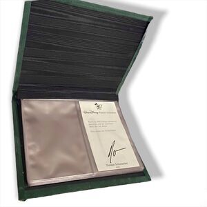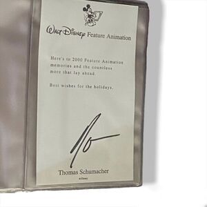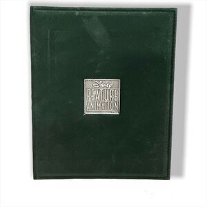 This handsome item was produced and distributed to Walt Disney Feature Animation employees as a year-end Holiday gift from management in 2000. The exterior is covered in green velvet and "Disney Feature Animation" plate is embedded in the front. The 18 bound-in plastic sheets will display a total of 72 photographs. Included is a printed note from Thomas Schumacher, then-President of WDFA.