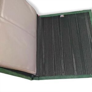 A green-velvet-covered hardcover album with 18 plastic holders for 4" x 6" photographs, 9.5" x 8"; lithography on card stock, 3.5" x 6"
