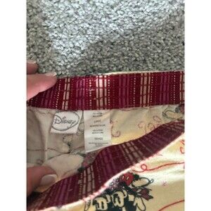 These Disney flannel pajama pants in size Large feature a festive Christmas theme with characters from Mickey Mouse, including Minnie and Mickey. Made from 100% cotton flannel, they are comfortable and warm for the winter season. The pants have an elastic closure and are machine washable for easy care. The cream, red, black, and white color scheme and embroidered accents add a touch of holiday cheer to the cute design. Perfect for any Disney fan looking for cozy and stylish sleepwear.