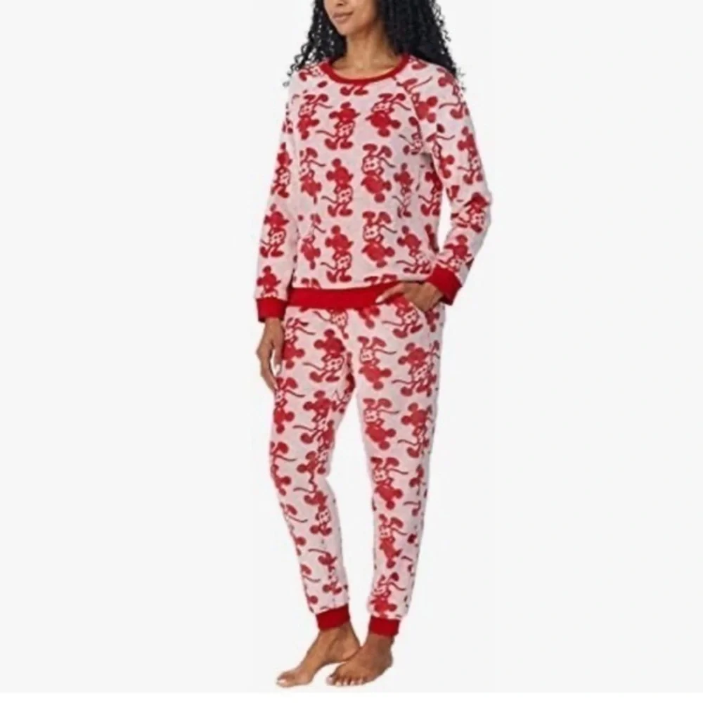 Disney Fleece Mickey Mouse Pajama Set Lounge Top Pants Red Cream