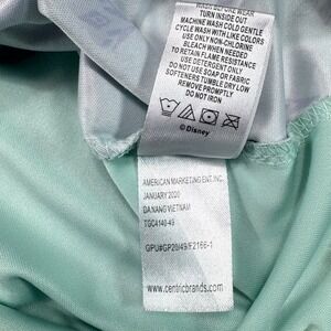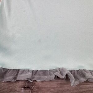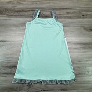 Disney Frozen 2 nightgown showcases Anna and Elsa with the "All Is Found" text, inspired by the Northuldra lullaby. This sleeveless sleep dress features a soft mint green base with a vibrant character graphic on the front and a delicate grey mesh ruffle trim along the hem and shoulder straps. The back is a solid mint green. Note that there are a few small, faint spots on the front and back as shown in the detail photos.