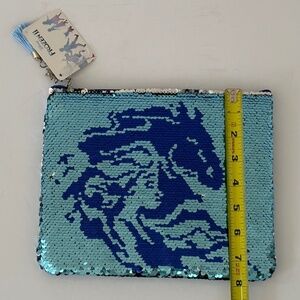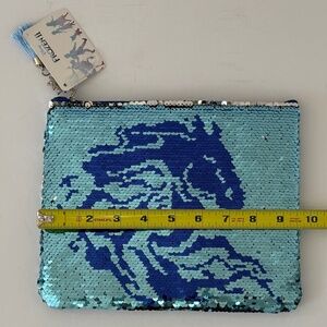 - Disney Frozen II Blue Sequin Pencil Case (Brand new with tags). Can also be used as a makeup bag or clutch purse. Recommended for ages 6+. Measures approximately 9.5" long x 8" high x 0.5" deep. One side features a scene with Elsa and the Nokk horse ("water spirit") while the other side has "FEARLESS" lettering. Tassel with snowflake zipper closure. Comes from a pet-free, smoke-free environment.