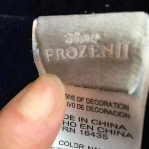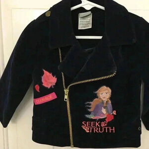 Disney Frozen II Navy Velour Jacket, Size 2T, Adorable Detail: Side Buckles at the waist line, “Seek the Truth” & “Courage” appliqué on front, zipper open with fold down defined collar, and “My Destiny’s Calling” appliqué on back, button detail defines both shoulders. 100 percent Nylon fabric with 100percent polyester jacket lining.