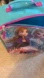 Colorful Frozen themed rolling suitcase with Anna and Elsa design. Features vibrant blue and pink colors. Use, but in great condition and shape.