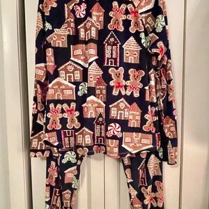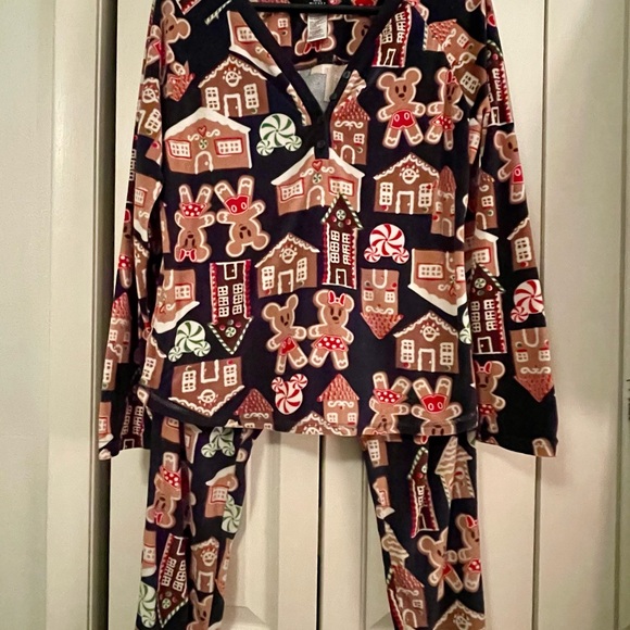 Charming Disney pajamas with gingerbread and candy design. Soft and comfortable for bedtime fun. 19’ armpit to armpit, 24’ long from shoulder, 27’ inseam.