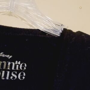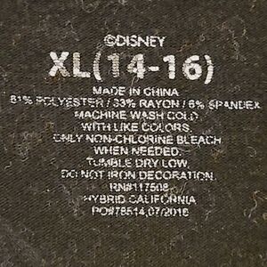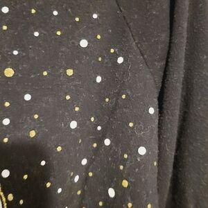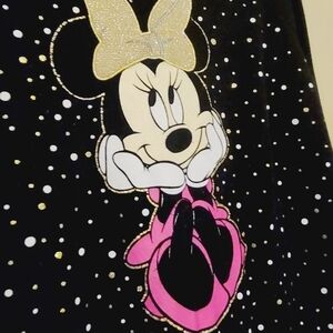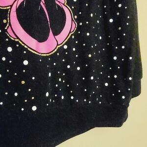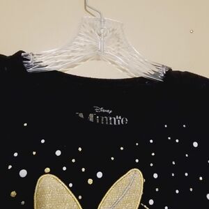 Headed to Disney soon?! Girl's vintage black polka dot and glitter Minnie Mouse crewneck sweatshirt by Disney, size XL, or girl's size 14/16. Black with gold and silver accents in the design. Slightly stretchy; polyester, rayon and spandex fabric blend. Excellent pre-owned condition overall; some lint and wear.