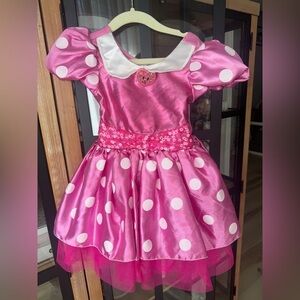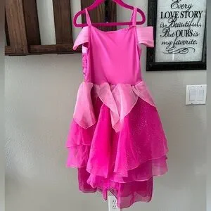 Gorgeous princess dress! Vibrant hot pink layered princess dress. Gold trim and jewel accent at the bodice. Sparkling tulle overlay and petal-style skirt panels. Off-shoulder straps with adjustable shoulder straps. Perfect for Halloween or dress up play.