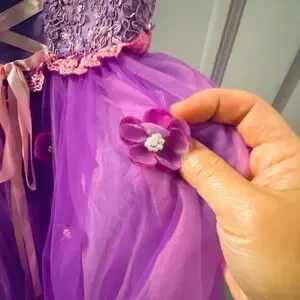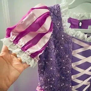 Disney Rapunzel-inspired dress. Puffy striped sleeves and lace-up front. Layered tulle skirt with floral accents. Soft bodice with shimmer details. Fits like a classic storybook costume.