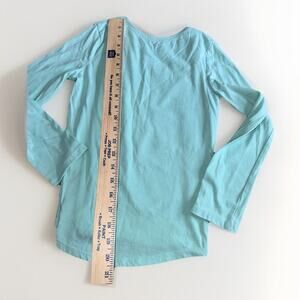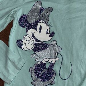 This adorable girls' size 7 long-sleeved shirt features a large, sparkly Minnie Mouse graphic on a soft mint green background. The shirt is in excellent used condition with no rips, stains, or tears. Perfect for any Disney fan!