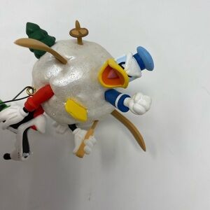 Charming Disney ornament featuring Goofy, Donald and Mickey. Perfect for holiday decor. Bright and playful design.