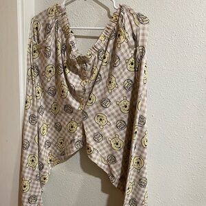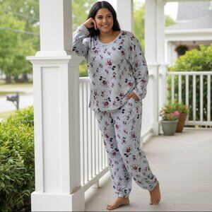 Charming Mickey Mouse design on a gray top. Paired with cozy cream plaid pants. Ideal for relaxing evenings.