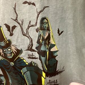 For sale is a Brand New Disney Parks Haunted Mansion Spirit Jersey size Medium. This unisex spirit jersey was exclusive to the Disney Parks classic Haunted Mansion Collection. Made in the El Salvador, this unique heathered cotton jersey features screen art of the beloved Disney Haunted Mansion characters like the Hatbox Ghost, Constance the Bride and the Mummy. The lettering and shadows glows in the dark. The front chest features the Haunted Mansion logo. Has original tags. Comes from a smoke free and pet free home.