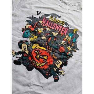 Show your love for spooky Disney magic with this Halloween graphic T-shirt from Walt Disney World. Features vibrant artwork of classic Disney characters in Halloween costumes and a bold Happy Halloween print. The shirt is in good pre-owned condition with plenty of life left perfect for fans and collectors looking to celebrate the season.