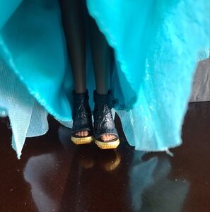 Doll with a stunning blue and green layered dress. Features intricate gold patterns and black gloves.