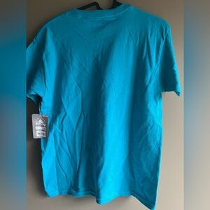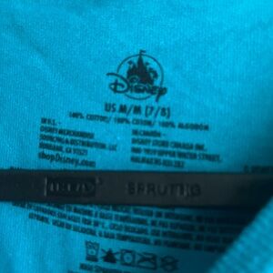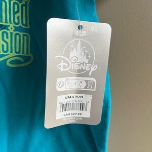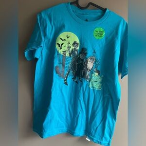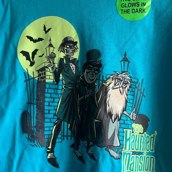 Bright blue shirt with spooky Haunted Mansion print of the hitchhiking ghosts.
