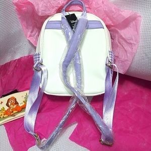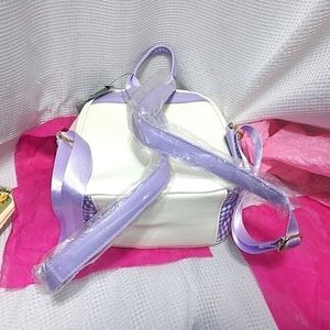 A beautiful and whimsical Alice in Wonderland Backpack in white and purple lavendar/lilac with lovely contrast fabric gingham
