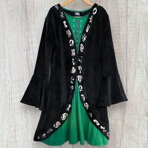 Enchanting Disney Hocus Pocus Mary Sanderson costume dress captures the whimsical spirit of the beloved character with its rich burgundy lace-up bodice and contrasting orange peasant-style sleeves. The multi-patterned skirt features a mix of textures and prints, including a distinctive houndstooth trim and layered fabrics that create a rustic, magical aesthetic. Perfect for Halloween, cosplay, or themed events, this dress includes authentic Disney branding and a comfortable smocked back for an adjustable fit.