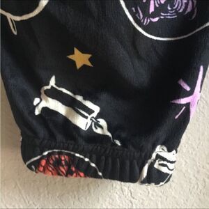 Witchy, stretchy, cosy, pj pants. Black background with purple, yellow, orange and white. Patterned all over with moons, eyes, stars, Billy’s hand and three witch sisters. Elastic waist with purple drawstring and elasticated ankle cuffs. Excellent condition. Disney Hocus Pocus 2 tag size Large.