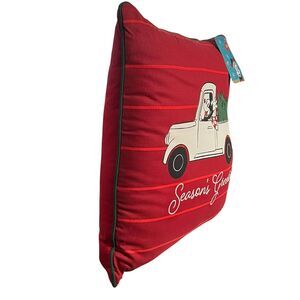 Features a festive red pillow with Mickey Mouse and Pluto driving a white truck carrying a Christmas tree, and "Season's Greetings" embroidered on the front
