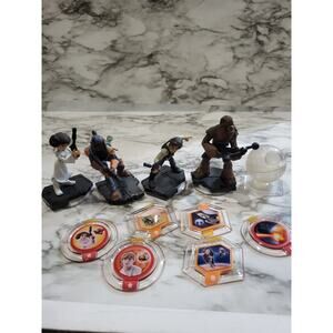 Disney Infinity 3.0 Star Wars figures including Leia, Chewbacca, Han Solo and Boba Fett. Also includes the 3.0 Star Wars cube for their game as well as 6 discs. All pieces in good condition.