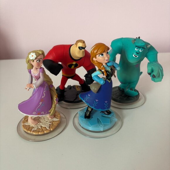 Lot comes with 4 characters shown in photos: Mr. Incredible from The Incredibles, Sully from Monsters Inc, Rapunzel from Tangled and Anna from Frozen.