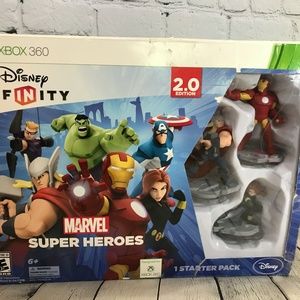 - Marvel Super Heroes (2.0 Edition) video game Starter Pack includes: 1 Disney Infinity: Marvel Super Heroes ,Video Game, 3 Marvel Super Heroes Figures: Iron Man, Thor and Black Widow, 1 Disney Infinity Base, 2 Toy Box Game Discs, 1 Marvel's The Avengers Play Set piece.