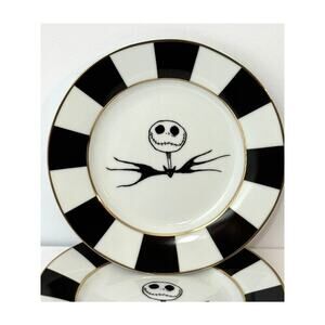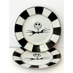 Add a spooky-chic touch to your kitchen or Halloween decor with this set of 2 Disney Jack Skellington plates. Inspired by Tim Burton’s The Nightmare Before Christmas, each 8-inch ceramic plate features Jack's iconic skeletal face with a bold black and white striped border and metallic gold trim. Perfect for collectors, Disney fans, or Halloween-themed table settings. In excellent condition—display-worthy or ready for use!