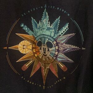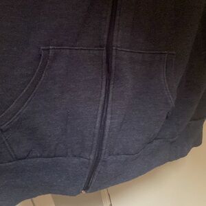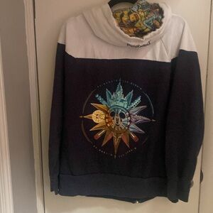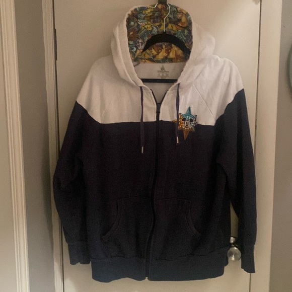 Disney zip up jacket from authentic Disney parks US size extra large white and navy blue Mickey Mouse logo front and back great preowned condition with 2 pockets in front and hoodie with string ties.