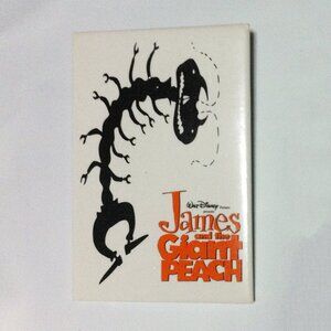 This rare promotional button was distributed at select movie theaters and fan events in early 1996 prior to the release of James and the Giant Peach. It features a silhouette of the centipede character along with the movie logo. The button measures approximately 2 1/8 inches x 3 1/8 inches. The button is a pin-back style with a black cardstock backing.