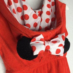 Disney Jr. Minnie Mouse, lovingly used, little girl's 2T, red terry cloth swimsuit coverup/romper. This great outfit is loaded with extras: elastic waist, two front pockets, embroidered Minnie face on left bodice area, an attached/lined hood in red and white polka dots and mouse ears and bow accents on hood (see pic # 3). Machine wash. FF 15 box 50