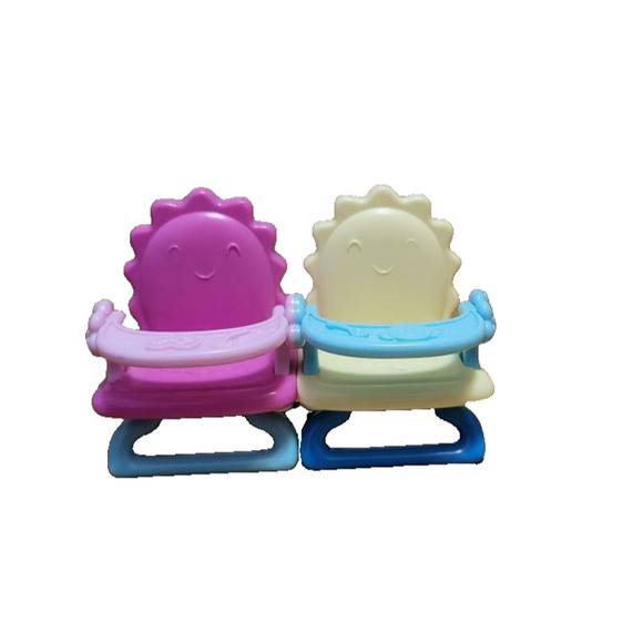 Add to your child’s Disney Junior Tiny Tots collection with this set of two twin highchairs from the 2019 McDonald’s Happy Meal toy line. These pastel-colored chairs feature smiling sun backrests and themed highchair trays with cute molded designs. Perfect as replacement pieces for nursery playsets or for imaginative stacking fun. Chairs securely interlock side-by-side or back-to-back for display or play.