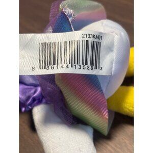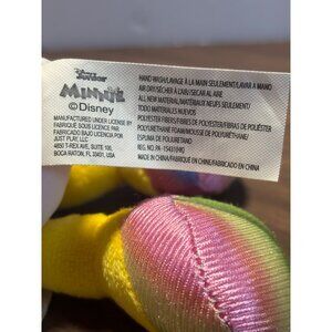 This 11-inch Disney Minnie plush doll features a charming rainbow dress with a unicorn graphic. Made by Just Play, it has a soft polyester design with vibrant details.