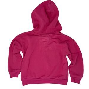 Preowned Disney Junior Minnie Mouse hoodie sweatshirt in toddler size 2T. Features a bright hot pink color with Minnie Mouse graphic print on the front, long sleeves, and hood. Soft cotton/poly blend fabric makes it cozy and comfortable for everyday wear.