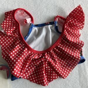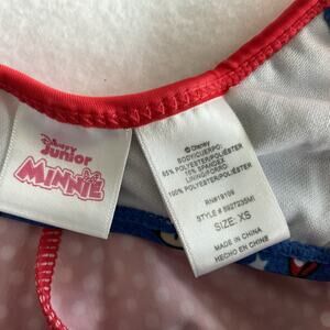 Bring Disney magic to swim time with this adorable Minnie Mouse swim top from Disney Junior, size XS. Featuring an allover Minnie print on a vibrant royal blue background and ruffle cap sleeves with red and white polka dot bows, this top is perfect for fun-filled beach days and poolside play.